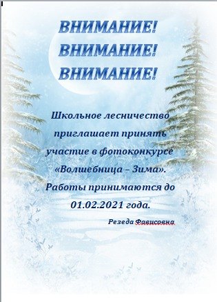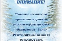 Школьное лесничество "Дубки" приглашает принять участие в фотоконкурсе "Волшебница - Зима". Работы принимаются до 01.02.2021 г.(работы приносить Мухутдиновой Р. Ф.) -