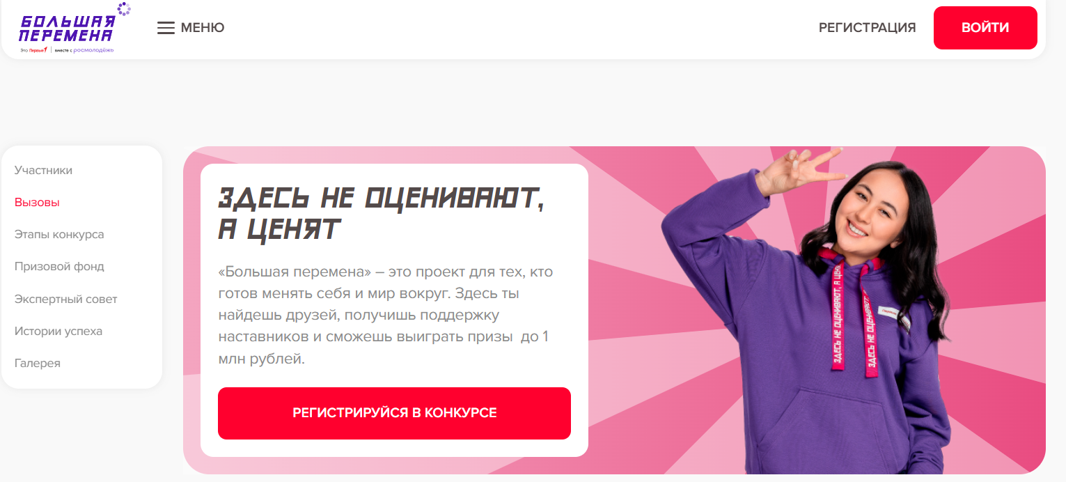 «Большая перемена» – это проект для тех, кто готов менять себя и мир вокруг. Здесь ты найдешь друзей, получишь поддержку наставников и сможешь выиграть призы до 1 млн рублей. Ссылка на регистрацию в конкурсе https://большаяперемена.онлайн/contest#Вызовы