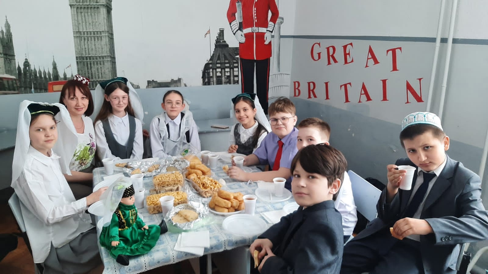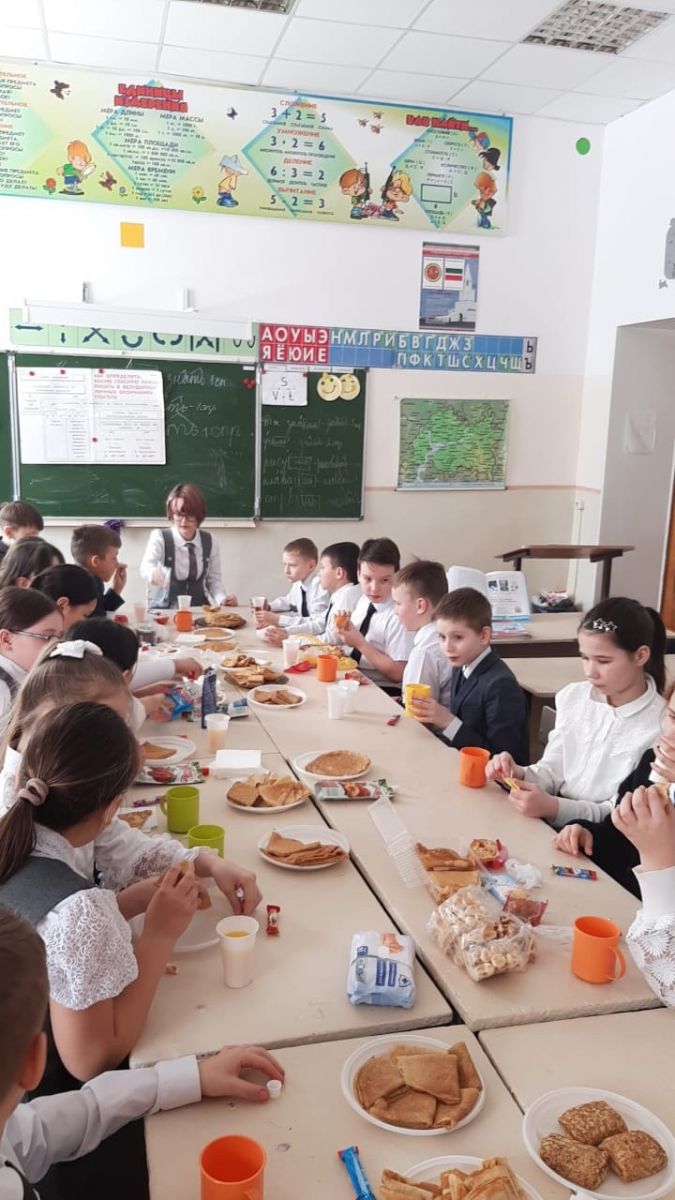 Бүген 5Б сыйныфында дәүләт (татар) теле дәресе түгәрәк өстәлләр артында үтте. Укучылар шигырьләр, алып килгән татар милли ризыклары турында сөйләделәр, татарча аралаштылар. Чәйләр бик тәмле, ә аралашу күңелле булды.