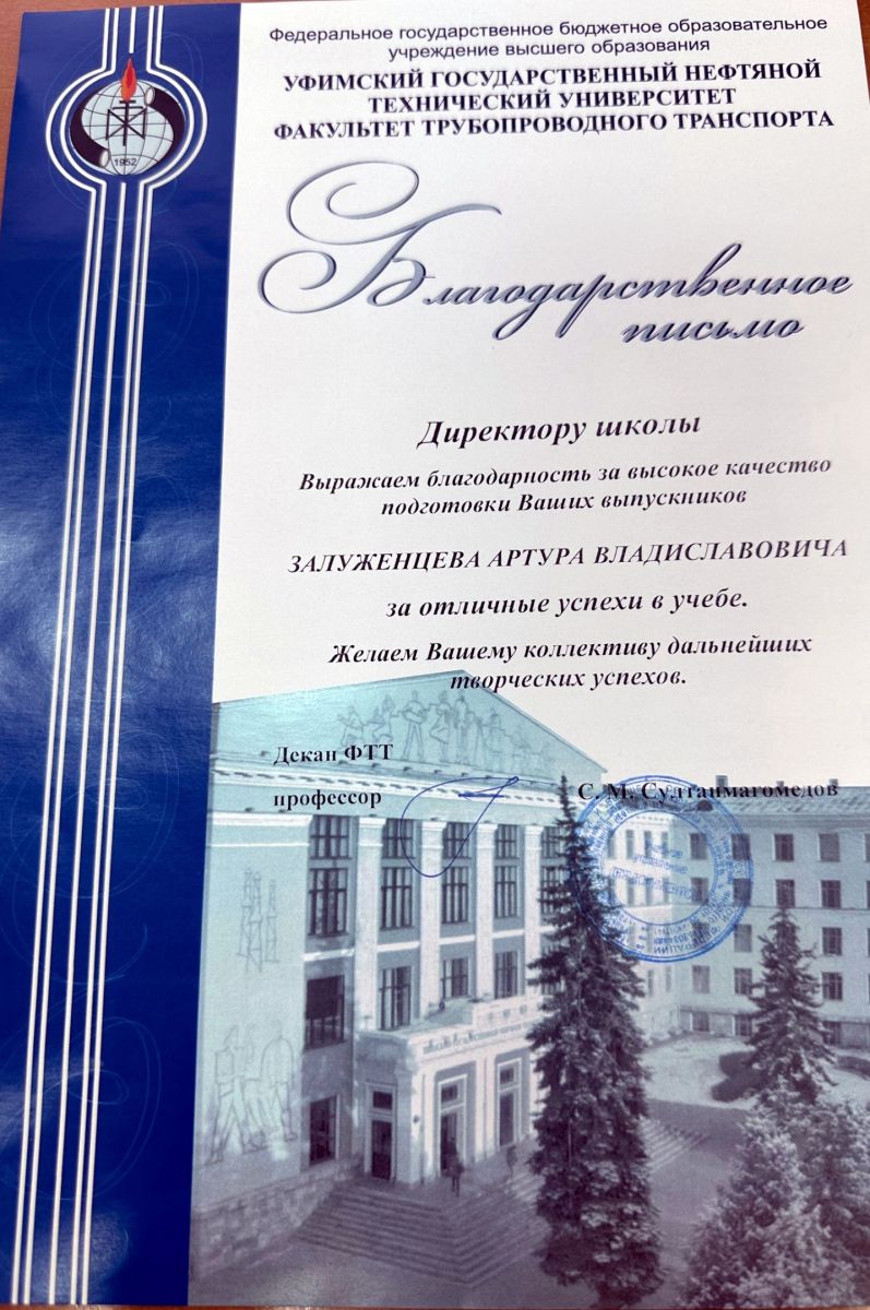 Наша школа получила благодарственное письмо от Уфимского государственного нефтяного технического университета!