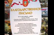 Ученица 9М класса Мухаметова Алина награждена благодарственным письмом за личный вклад в реализацию программ по патриотическому воспитанию молодежи и активную деятельность в первом республиканском этапе Всероссийского конкурса "Растим патриотов России", посвященного 70-летию Победы в Великой Отечественной войне 1941-1945 годов.