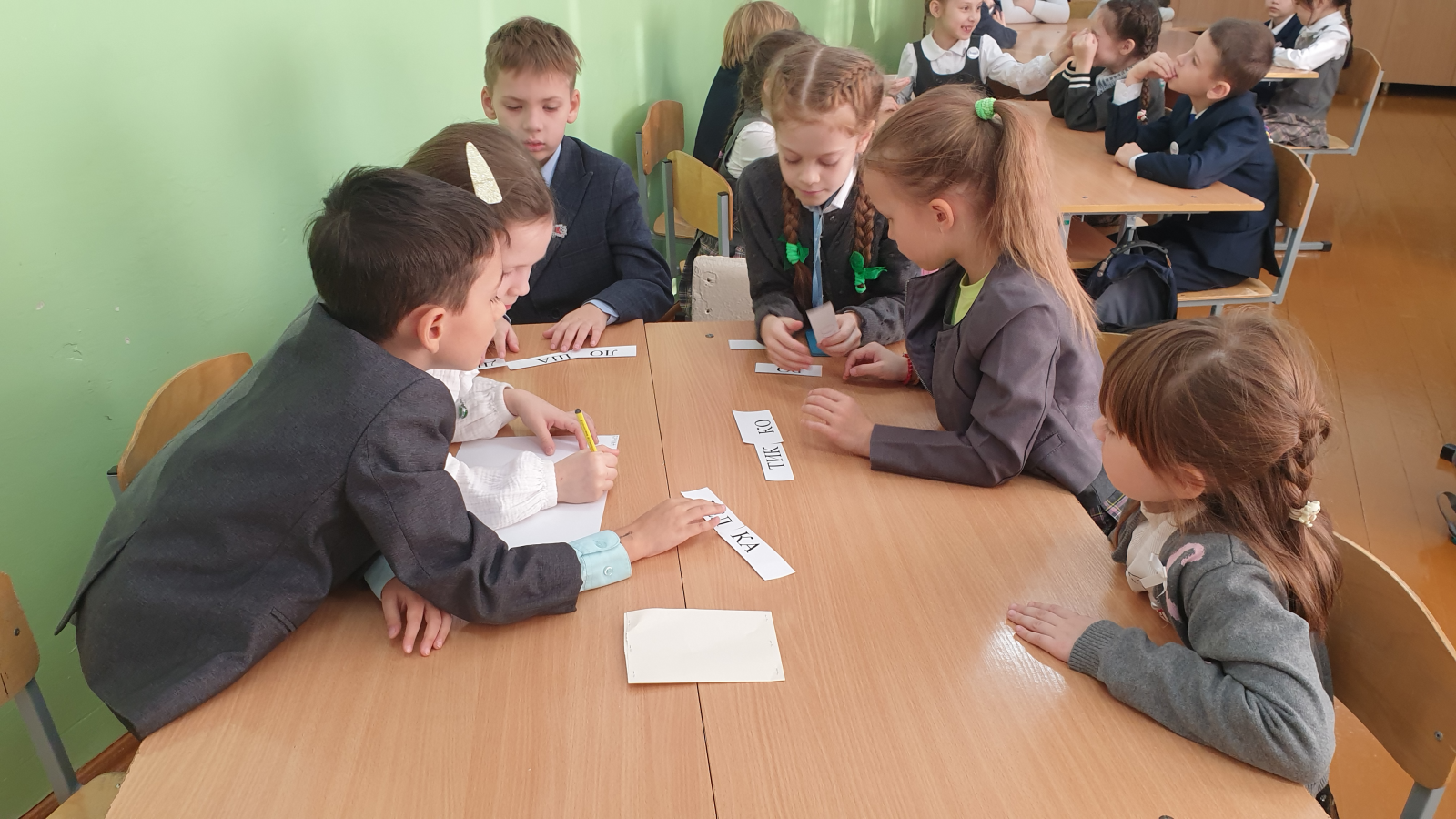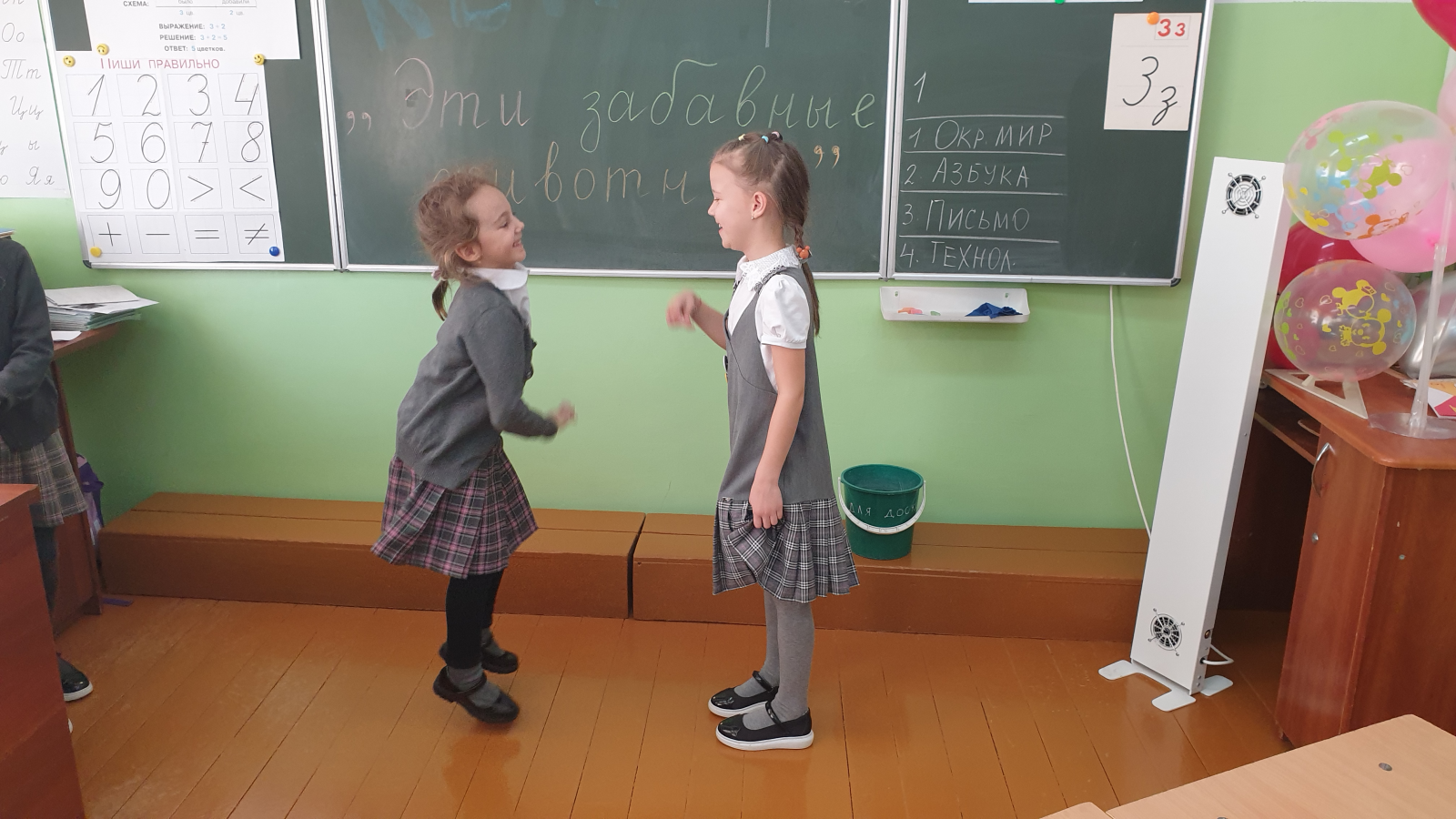 В рамках проведения Недели начальных классов в 1-х классах прошел КВН " Эти забавные животные". Команды 1А класса"Пингвины" и 1Б класса "Черепахи" отгадывали загадки, показывали пантомимы, собирали пазлы, составляли названия животных из слогов, пели песни про животных. Ну а победила, конечно же- Дружба!