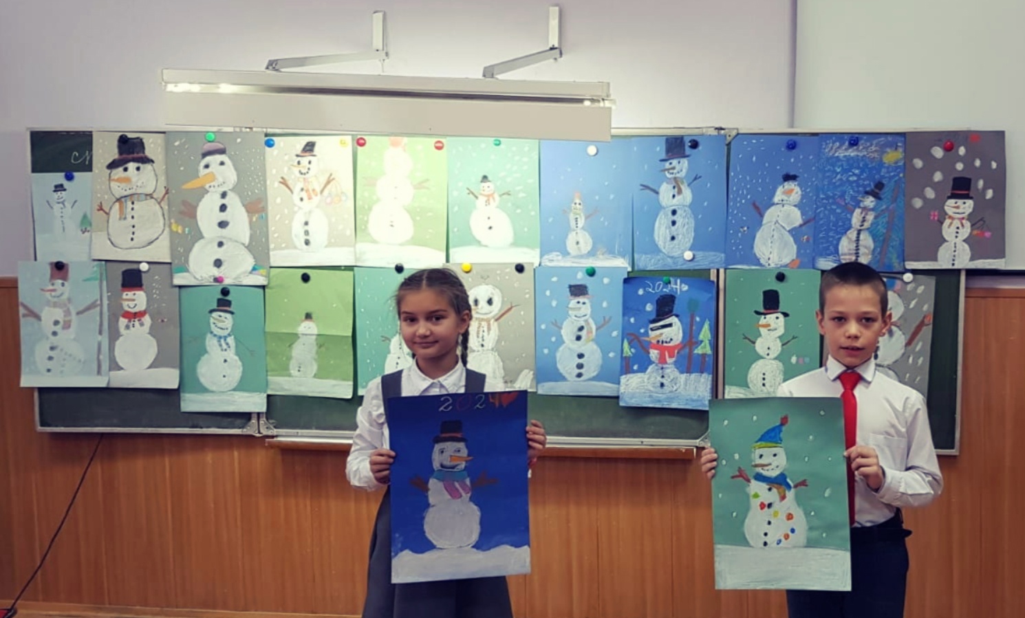 Конечно милых, весёлых снеговичков! Вот такие снеговики получились у ребят 2Б класса.