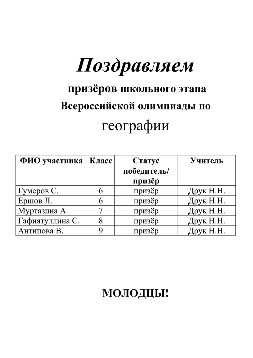 12 октября на базе МБОУ Лицей №12 прошел муниципальный чемпионат по физике среди 8-х классов. В чемпионате принимали участие 10 школ нашего города. Команда нашей школы "Архимед" (руководитель Писанова С.Г.) заняли почетное 1 место. Поздравляем, желаем дальнейших успехов и любви к физике!!!