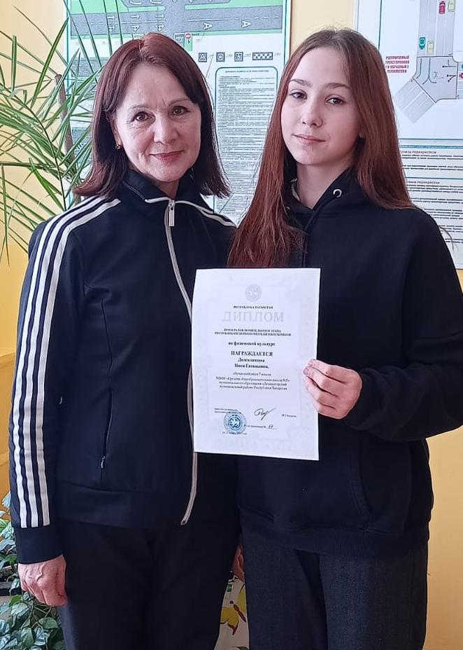 Поздравляем призера заключительного этапа республиканской олимпиады по физической культуре среди учащихся 7,8 классов, Долголаптеву Н., ученицу 7 класса и учителя физической культуры Абдуллину Р.Г. Желаем новых побед!