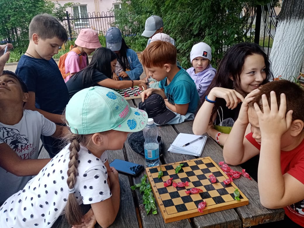Опубликовано: 20.07.202220 июля - Всемирный день шахмат. Ребята посетили шахматную школу. Все было очень интересно. После шахматной школы для детей был организован шашечный турнир, но вместо привычных черных и белых фигур на доске оказались конфеты.