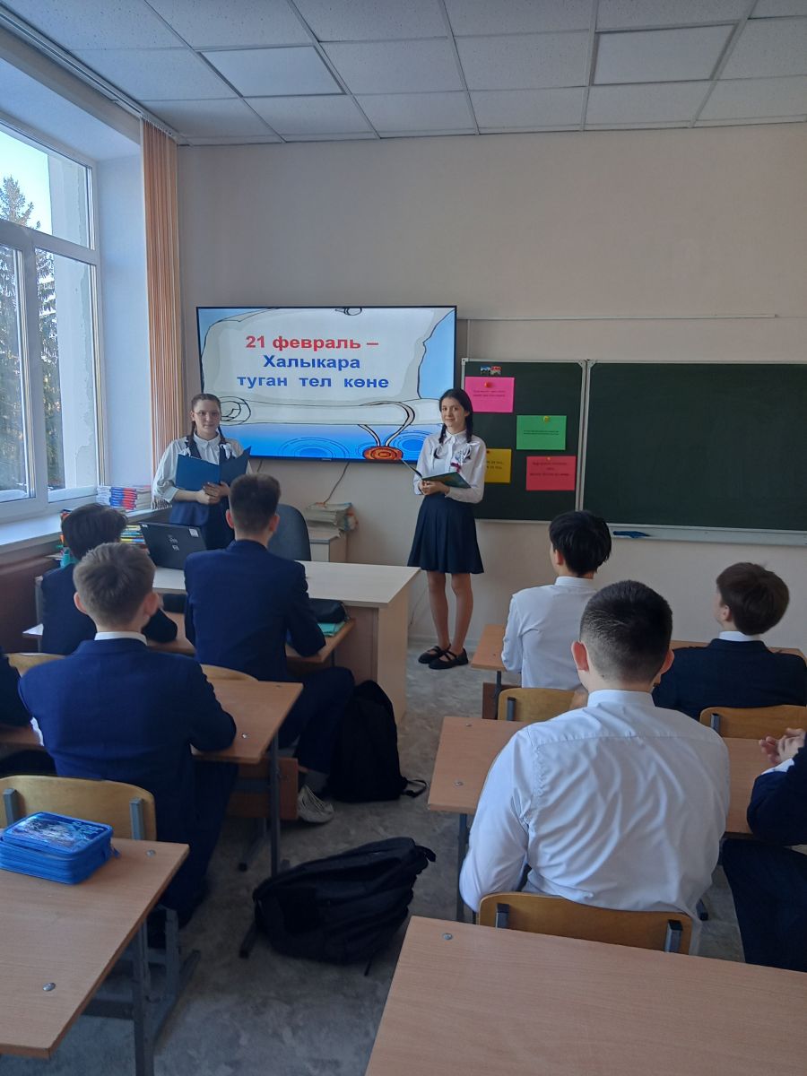 В 9 АВ классе на уроке Государственного (татарского) языка РТ прошло литературное мероприятие “Туган телем – иркә гөлем ”, посвященное Дню родного языка.Учащиеся рассказывали стихи о родном языке, отвечали на блиц-вопросы, изучали особенности происхождения тюркских языков.