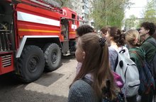Сотрудники пожарной части побеседовали с детьми, познакомили их со специальной одеждой пожарного. Они рассказали о пожарной технике и показали детям, как и чем оборудованы машины, для чего служит тот или иной предмет из многочисленного пожарно-технического вооружения. Дети одевали тепло- отражательные костюмы, боевое обмундирование и снаряжение. Был организован практикум (тушение пожара) по подаче воды по улице Вахитова. После этого учащиеся просмотрели видеофрагмент «Правила поведения при пожаре». Ребята остались довольны экскурсией. Много фотографировались, выразили слова благодарности пожарным, которые смогли так интересно и доступно донести до ребят информацию о нужности и важности своей профессии.