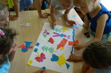 Начался день с беседы о любви к любимым питомцам. Потом ребята посетили Центральную детскую библиотеку имени Ю.Гагарина и побывали на познавательном занятии "Братья наши меньшие: радости и опасности". После обеда дети разбились на группы и потрудились в своих творческих лаборториях, изготовив из геометрических фигур панно "Мои любимые животные".