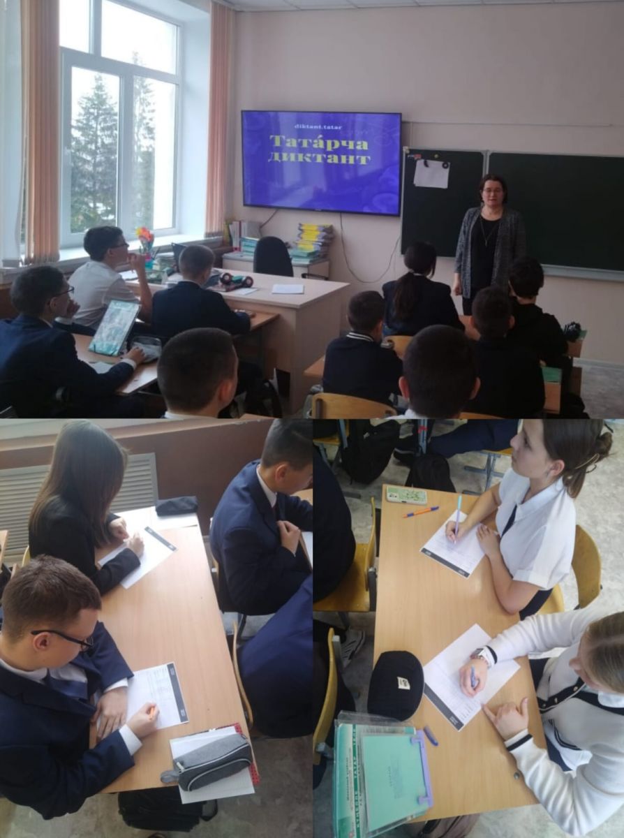 8 нче ноябрь көнне мәктәбебез укучылары “Татарча диктант” акциясендә катнашты. Акциянең максаты – татар теленә кызыксынуны арттыру, әдәби телдә дөрес сөйләм һәм дөрес язу күнекмәләрен үстерү, орфографик һәм грамматик хаталар ясамыйча язу теләге уяту, татар теле белгечләрен һәм туган тел (татар теле) укытучыларын тагын да популярлаштыру. Диктант тексты Мирсәй Әмирнең “Агыйдел” әсәреннән алынган иде.