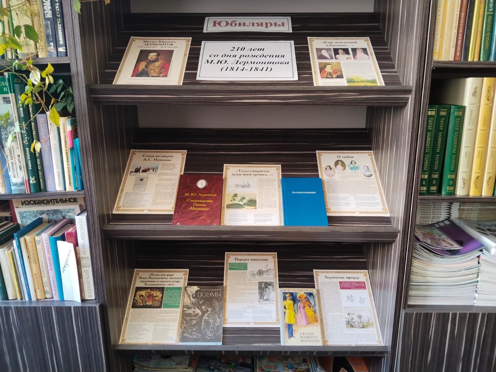 К 210-летию со дня рождения Михаила Юрьевича Лермонтова в школьной библиотеке для учащихся 8-11 классов оформлена выставка литературы «Юбиляры». На ней представлены интересные факты биографии поэта, сборники его произведений и высказывания известных деятелей литературы о М.Ю. Лермонтове.
