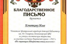 Открытие Недели детской и юношеской книги состоялось 10 марта в Центральной городской детской библиотеке им. Ю.Гагарина. По традиции, в нем участвовали ребята, сочиняющие стихи, рассказы, сказки. От нашей школы с чтением своих стихотворений выступили Секретарева Виктория (3 Б класс), Матвеев Данил (3 Б класс) и Кочетков Илья (8 А класс). За успехи в поэтическом творчестве, за участие в издании Рукописной книги – 2015 г. «По страницам творчества юных талантов» ребятам вручены Благодарственные письма и сладкие подарки. Поздравляем и желаем дальнейших творческих успехов!