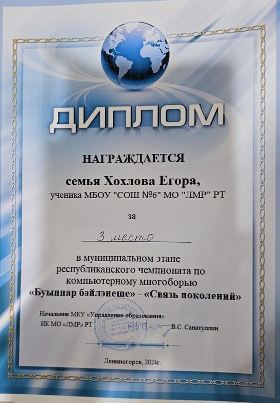 13 апреля в муниципальном этапе республиканского чемпионата по компьютерному многоборью ,,Связь поколений. Буыннар бәйләнеше" приняла участие и заслужила lll место семья ученика 2 А класса Хохлова Егора. Поздравляем его деда Егорова Николая Павловича, маму Хохлову Светлану Николаевну с победой! Молодцы! Желаем дальнейших успехов и побед