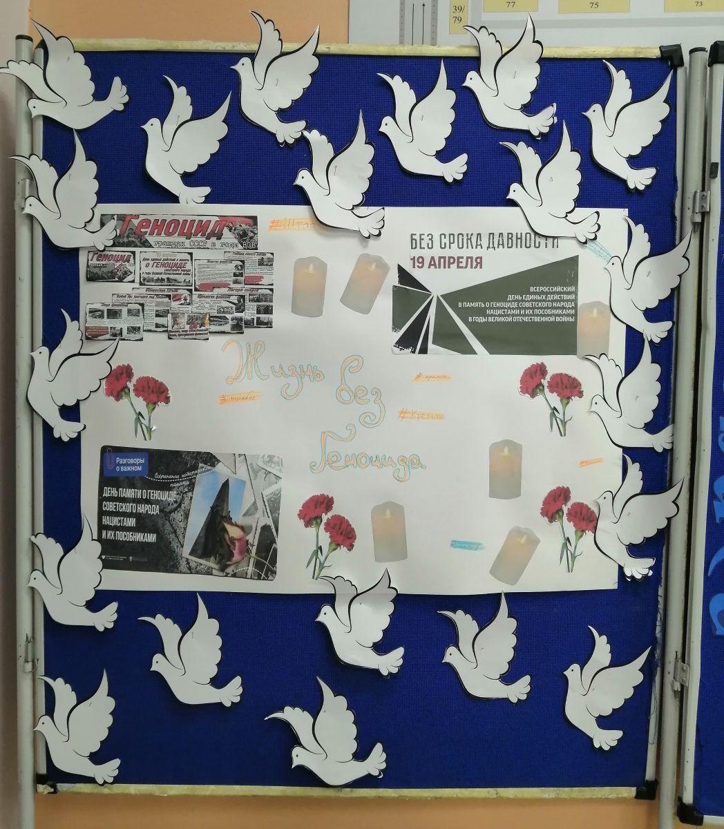 Ежегодно 19 апреля проводится День единых действий в память о геноциде советского народа нацистами и их пособниками в годы Великой Отечественной войны 1941-1945 гг. Так, советник по воспитанию МБОУ №6 со взаимодействием классных руководителей, провела единый урок «Без срока давности», акции «Письмо в будущее «Нельзя забыть», классные часы «Человек лишь памятью храним», оформили информационный стенд в фойе школы.