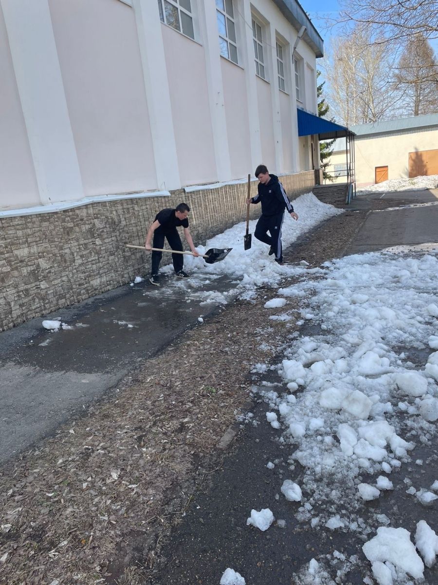 Ребята убирали территорию школы от мусара,разбрасывали снег.