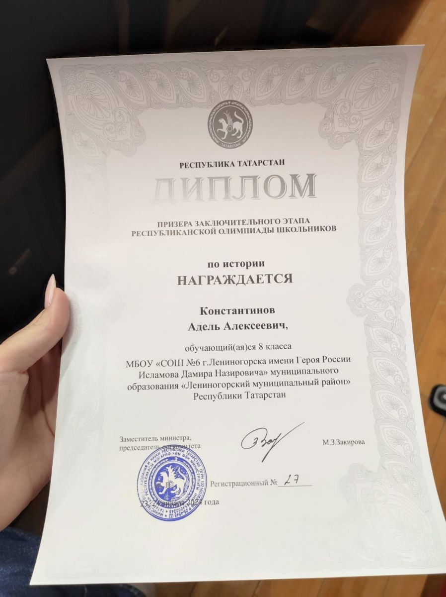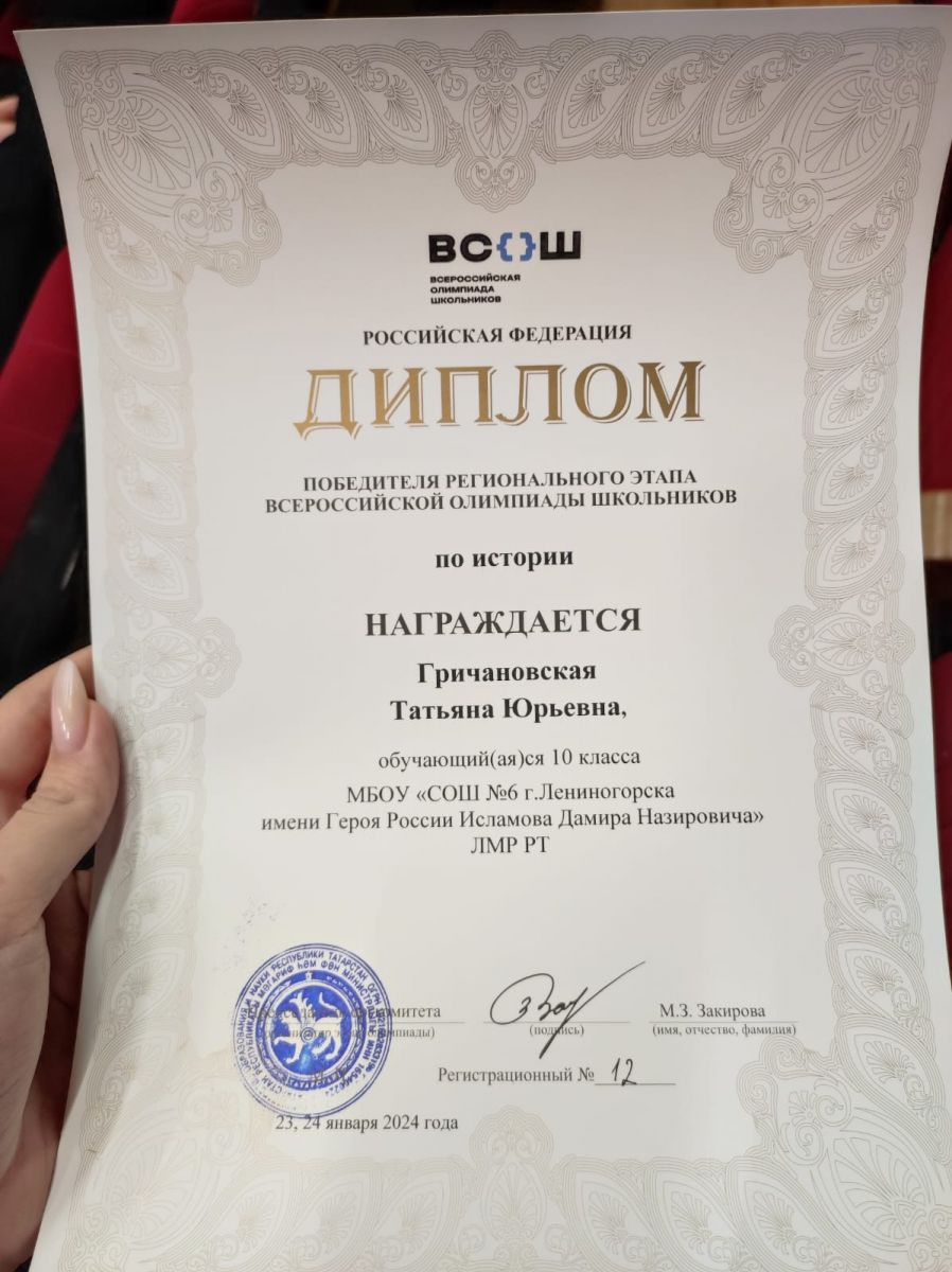 С 22.01.24 по 25.01.24 г. проходил региональный этап всероссийской олимпиады школьников по истории. В олимпиаде приняли участие учащиеся 8 В класса Константинов Адель и Сайфутдинова Дина, 10 Б класса Гричановская Татьяна.