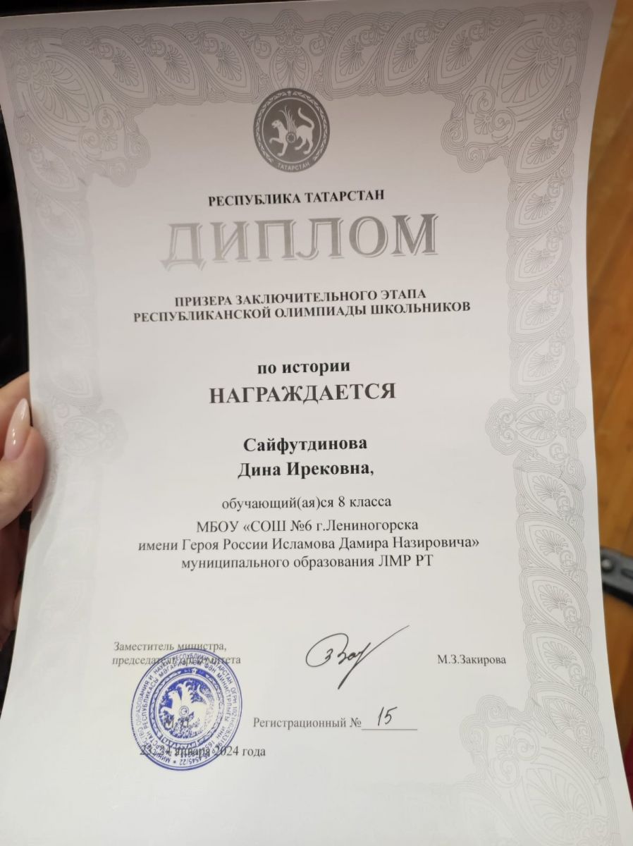 Поздравляем Аделя и Диану, учащихся 8 В класса с призовым местом и победителя Татьяну, ученицу 10 Б класса, а также учителей истории и обществознания, подготовивших призеров, Хайруллину Елену Анатольевну и победителя олимпиады Романову Наталью Анатольевну.