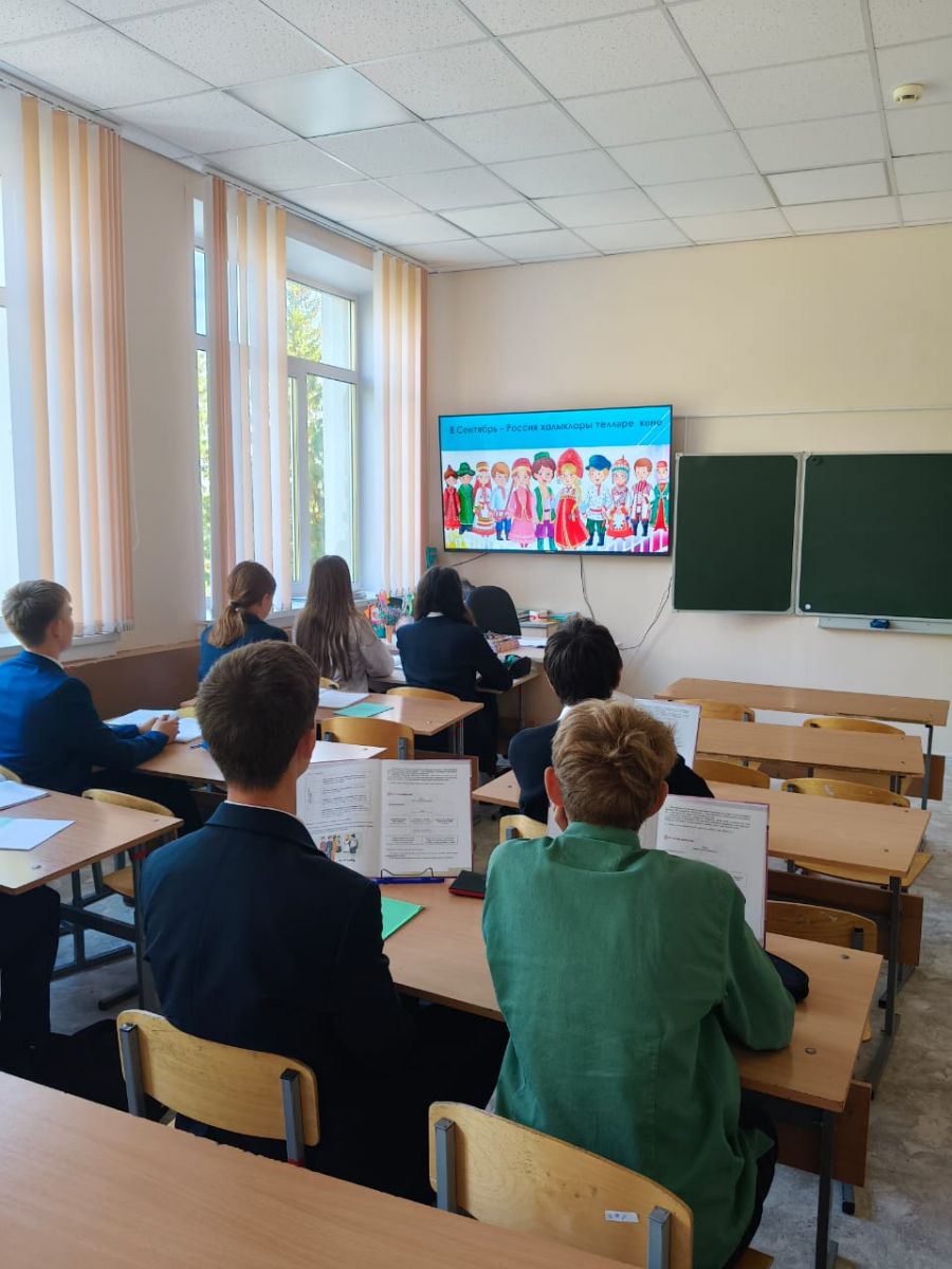 10АБ сыйныфы укучылары туган тел дәресләрендә Россия халыклары телләре турында әңгәмә кордылар. Россиядә 190 нан артык милләт вәкиле яши, алар 270 телдә һәм диалектларда аралаша. Р.Гамзатов, Г.Тукай, А.Пушкин шигырьләрен ике телдә укыдылар.