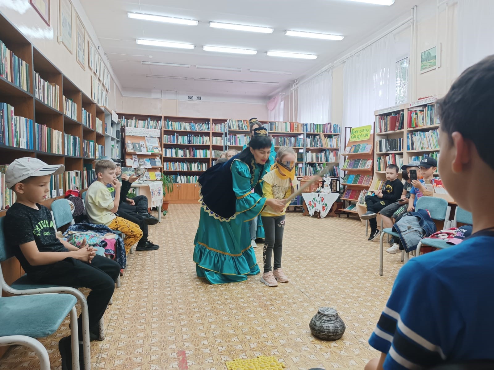 В первой половине дня ребята посетили центральную библиотеку, где на «Веселом празднике Сабантуй» познакомились с татарскими национальными играми и принимали в них участие.