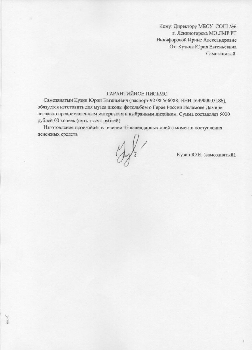 Муниципальное бюджетное общеобразовательное учреждение «Средняя общеобразовательная школа №6 г.Лениногорска имени Героя России Исламова Дамира Назировича" муниципального образования "Лениногорский муниципальный район" Республики Татарстан