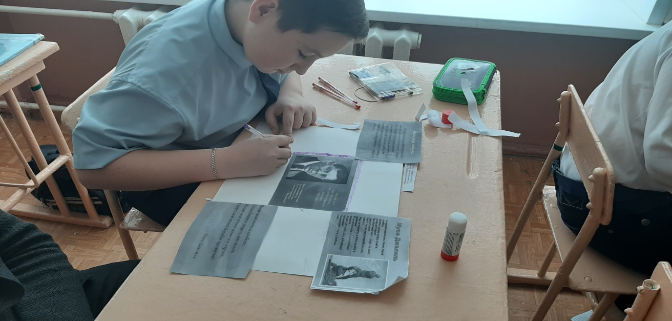 В рамках года родных языков и народного единства в Республике Татарстан, ученики 7 класса подготовили выпуск стенгазеты приуроченного к 115-летию со дня рождения великого сына татарского народа, поэта-героя Мусы Джалиля.Татарстан Республикасында Туган телләр һәм Халык бердәмлеге елы кысаларында 7 нче сыйныф укучылары татар халкының бөек улы, Шагыйрь-герой Муса Җәлилнең тууына 115 ел тулу уңаеннан стенгазета чыгардылар.