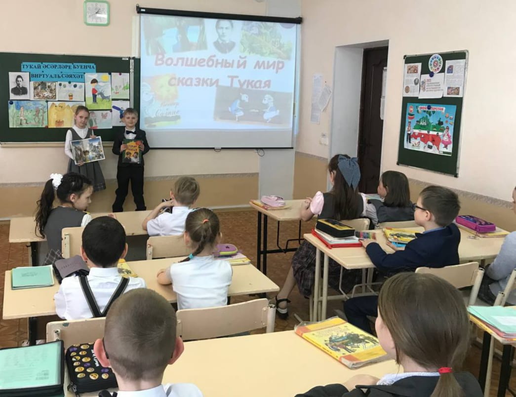 25 апреля в рамках Недели родного языка и литературы с учащимися 2В и 2Г класса прошло увлекательное виртуальное путешествие в страну сказок Г. Тукая. Ребята познакомились жизнью и с творчеством великого татарского поэта, который оставил огромное творческое наследие. Ценно то, что произведения Г. Тукая пронизаны глубокой любовью к родному краю, его природе. Учащиеся активно участвовали в викторине «Сказки Тукая», прочитали его известные произведения. В конце мероприятия с удовольствием посмотрели мультфильмы по творчеству Тукая.