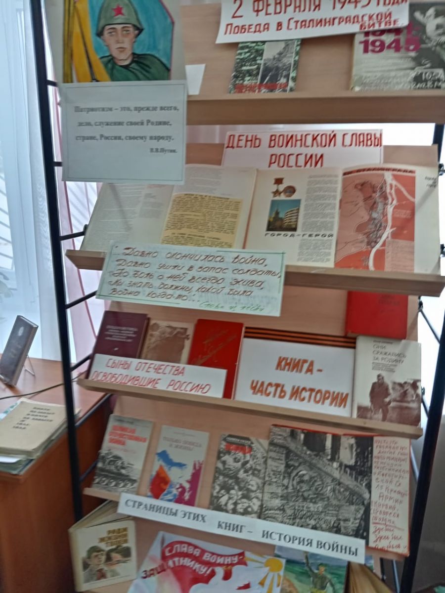 В школьной библиотеке оформлена книжная выставка «Да не прервется наша память». На выставке представлены книги-свидетели тех страшных времен. В одной из представленной на выставке книг «Дни воинской славы России», можно найти информацию об участии наших земляков в разгроме немецко-фашистских войск в Сталинградской битве.
