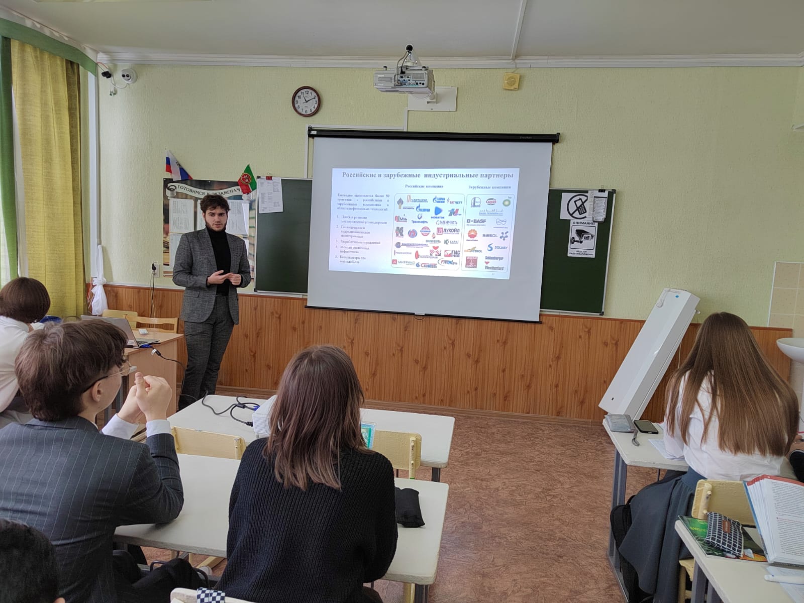 Профориентационное занятие «Россия гостеприимная: узнаю о профессиях на благо общества» было проведено в 10Б классе. Оно было посвящено теме туризма и гостеприимства. Для государства туризм и сфера гостеприимства — важная отрасль экономики. И конечно, в этой сфере важны профессии, которые помогают делать отдых комфортным и интересным. С ними ознакомились старшеклассники в ходе занятия. Гостем внеурочного мероприятия был студент 1 курса КФУ Антонов Роман, выпускник школы №2. Он подробно рассказал о своем вузе, специальностях, которые там можно получить, проходных баллах и освятил все преимущества обучения в институте геологии и нефтегазовых технологиях. Встреча была очень интересна и полезна для ребят. Самый активный собеседник получил приз с логотипом КФУ.