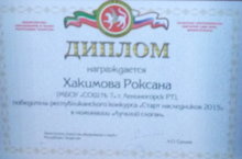 Хакимова Роксана, ученица 5Г класса стала победителем республиканского конкурса "Старт наследников 2015" в номинации "Лучший слоган". Поздравляем!!!