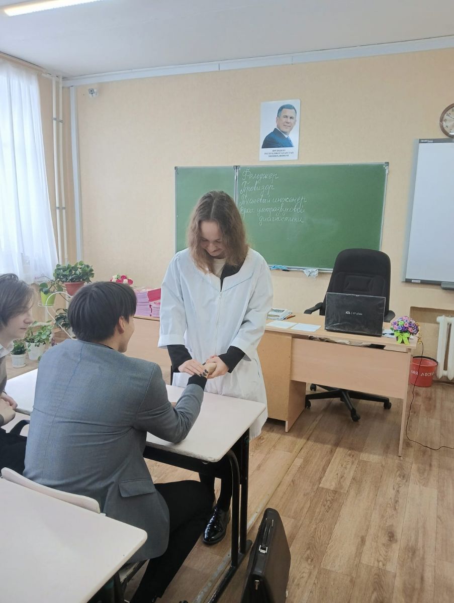 Сегодня в 11 классе прошло профориентационное занятие «Россия здоровая: узнаю о профессиях и достижениях страны в области медицины и здравоохранения». Ребята узнали о существующих профессиях в здравохранении, провели игру,, Было- стало", попробовали себя в роли врача.