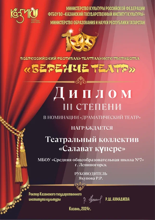 16 января 2024 года в Казанском государственном институте культуры в целях выявления и поддержки детских театральных коллективов, а также приобщения участников коллективов к театральному искусству преподавателями кафедры театрального творчества факультета театра, кино и телевидения при поддержке Министерства культуры РФ, Министерства культуры РТ, Министерства образования и науки РТ и Республиканского центра внешкольной работы состоялся Гала-концерт и торжественная церемония награждения победителей Всероссийского фестиваля театрального творчества «Беренче театр».