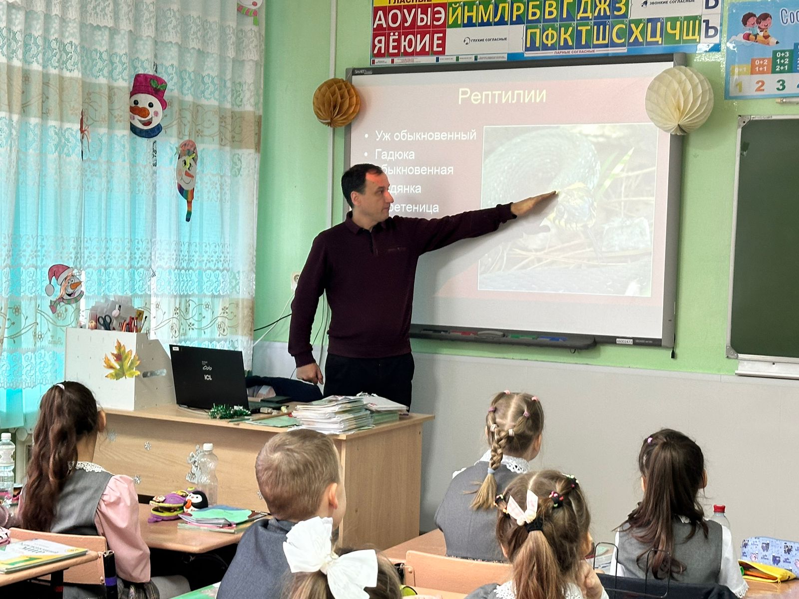 1 декабря в 1-х классах состоялась встреча с государственным инспектором по охране природы, специалистом государственного природного заказника "Степной" им. А. И. Щеповских Галямутдиновым Х.Х. Встреча была посвящена вопросам охраны растений и животных, Красной книге. Ребята узнали о животных и растениях заказника, услышали интересные факты о животных.