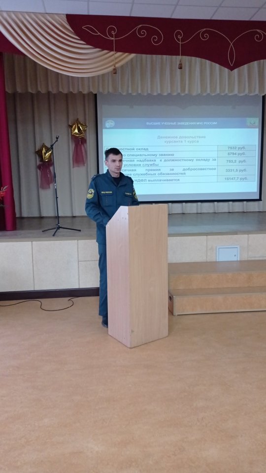 21.09.23 в рамках внеурочной деятельности "Россия - мои горизонты" для учащихся 9-11-х классов прошла встреча с начальником караула дежурной смены пожарной части #66 Галиевым Асланом Ринатовичем. Он рассказал учащимся о ВУЗах МЧС, какие экзамены ЕГЭ надо сдавать, о специальностях, условиях обучения, досуга студентов, размере стипендии. Учащиеся просмотрели видеофильм и презентацию.