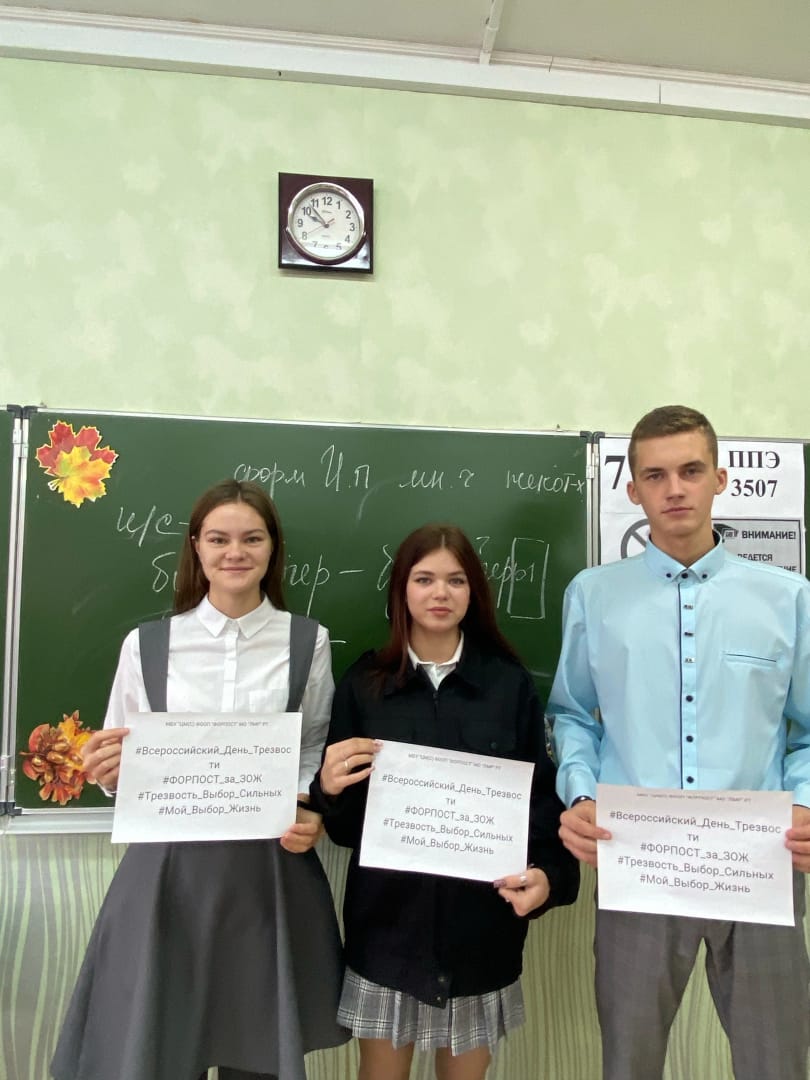 Сегодня активистами школьного отряда Форпост была проведена Акция «Трезвая Россия – здоровая нация!». Цель акции - распространить сведения о вреде и необратимом действии алкоголя на человеческий организм.