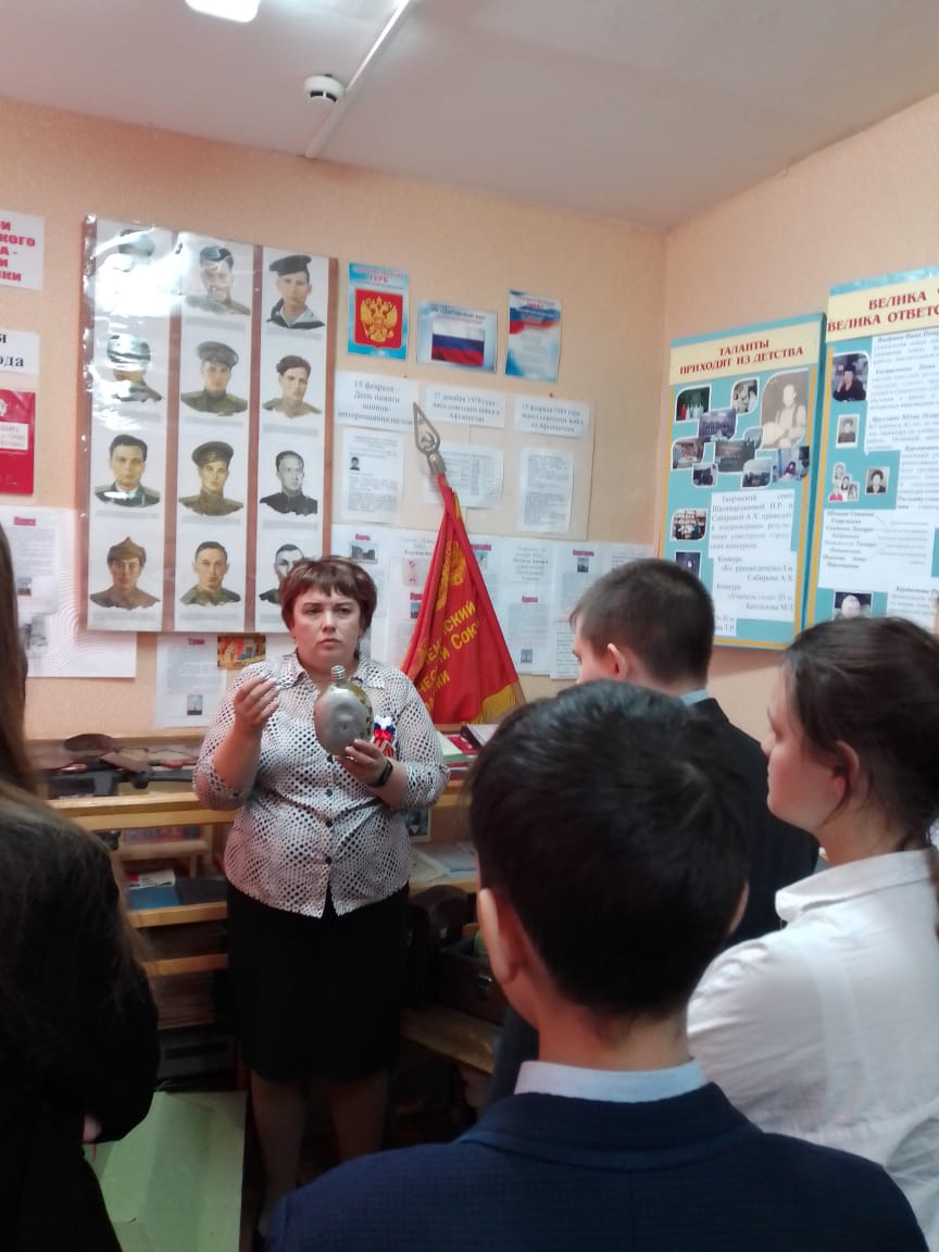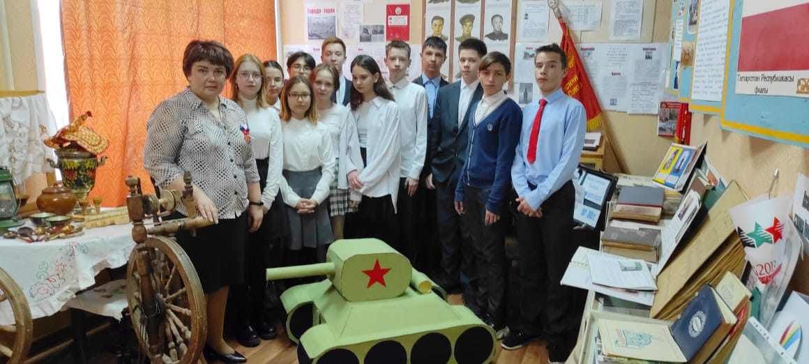 Учащиеся 8б класса посетили школьный музей. Руководитель музея, Блинова О. В., рассказала ребятам об основных событиях Великой Отечественной войны, продемонстрировала экспонаты музея, связанные с военными событиями. Также вспомнили о героях СССР - наших земляках.