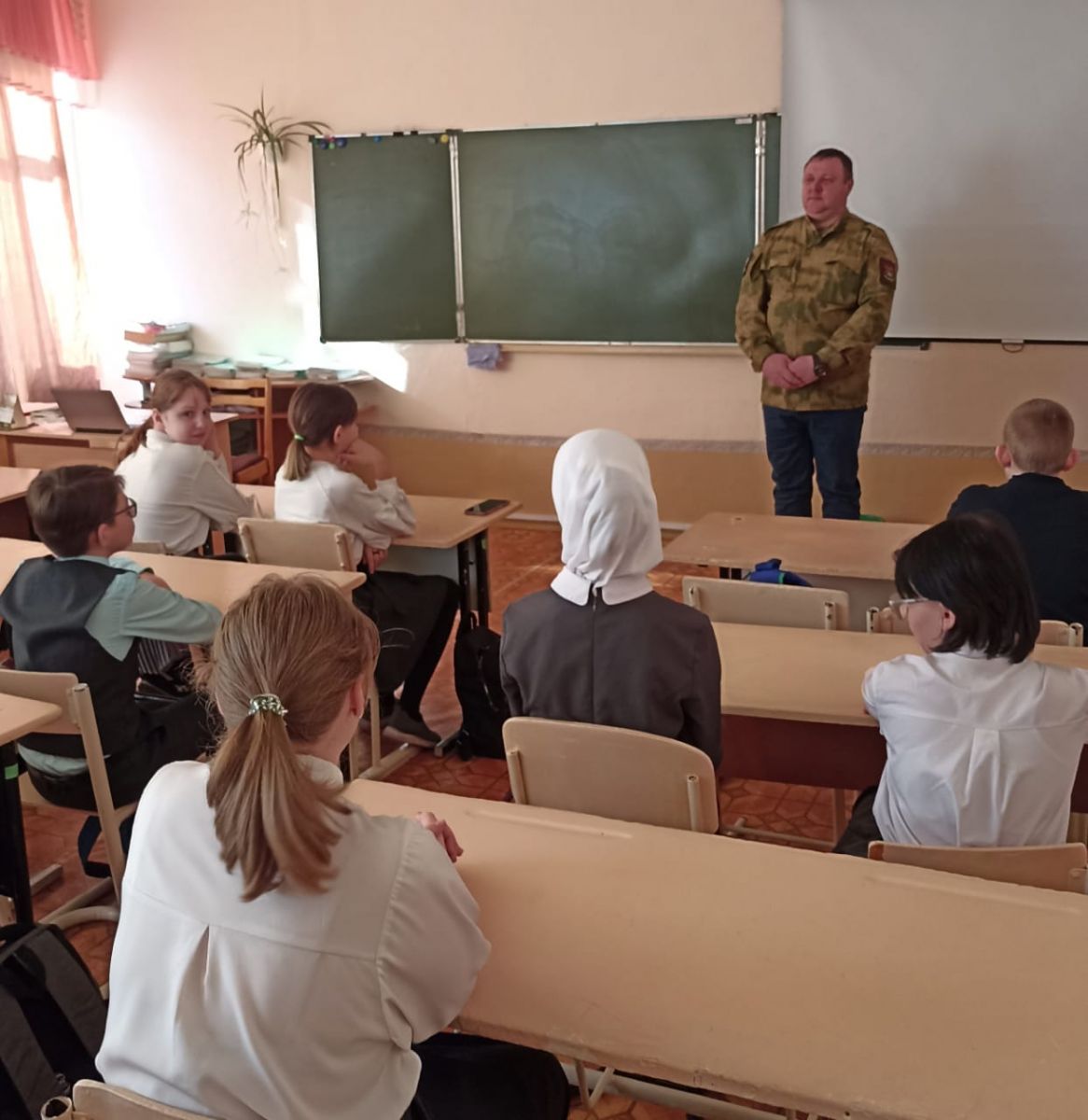 С целью патриотического воспитания на классный час в 5Г классе был приглашён участник боевых действий СВО Зубов Денис Сергеевич, который был техником первой мотострелковой роты 72-ой бригады в национальном батальоне "Алга", но по причине ранения был вынужден вернуться домой. Он рассказал ребятам о боевом духе военнослужащих, о том, как приходится преодолевать страх, о чувствах, которые испытывают бойцы, получая письма от учащихся из разных уголков страны. Ребята с живым интересом пообщались с бойцом, получив ответы на все заданные ему вопросы. На конкретном примере учащиеся увидели, что такие самоотверженные участники боевых действий живут рядом. Мужество, храбрость, любовь к Родине - это качества настоящего человека. Им есть с кого брать пример.