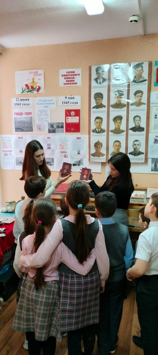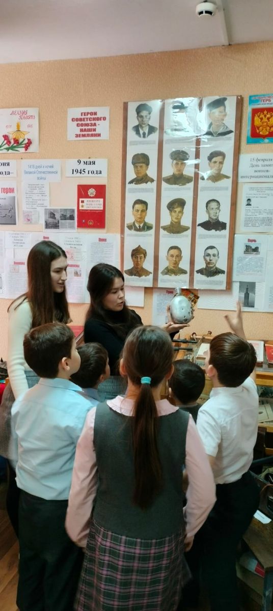 В рамках месячника по патриотическому воспитанию старшеклассники провели экскурсии для учащихся 1-2 классов. В школьном музее представлена военная экспозиция: личные предметы солдат, награды, военные экспонаты, книги памяти.