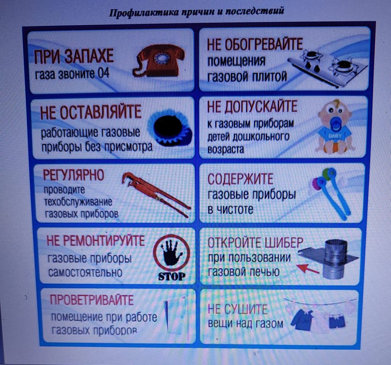2. При появлении запаха газа закройте все газовые краны, проветрите помещение, не зажигайте огня, не включайте и не выключайте электроприборы, вызовите аварийную бригаду по тел. 04.