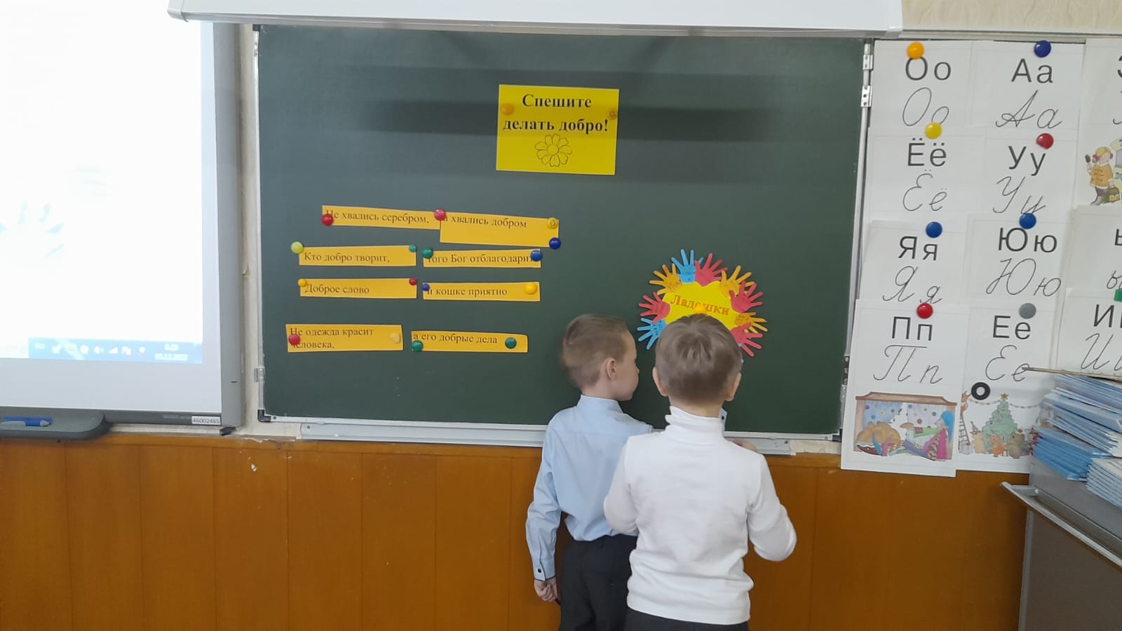 С целью формирования первоначального представления у обучающихся, что такое добро, доброта, доброжелательность, добрые дела 5 декабря в рамках внеурочного занятия "Разговоры о важном" в 1В классе организовано мероприятие "Если добрый ты..." . Ребята узнали, кто такие волонтеры, рассказали о добрых делах, вместе с Леопольдом исполнили песенку о добре, собрали пословицы, а также поделились добротой ладошкой добра.