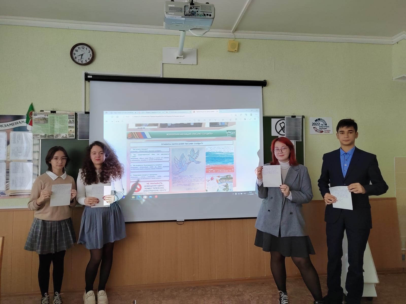С целью ознакомления обучающихся с примерами героизма и мужества различных поколений защитников Отечества, оказания поддержки участникам специальной военной операции, а также мобилизованным военнослужащим, проходящим подготовку и боевое слаживание 17 октября в школе были проведены уроки Мужества «Ратная слава героев российской земли». Ребята познакомились с отличительными чертами российского воинства- героизмом и самопожертвованием, узнали о причинах специальной военной операции и подвигах военнослужащих Вооруженных Сил РФ, о нашем земляке - герои России Дамире Исламове. Также ученикам рассказали о Всероссийской акции «Письмо солдату», порядке написания и оформления писем военнослужащим в их поддержку.