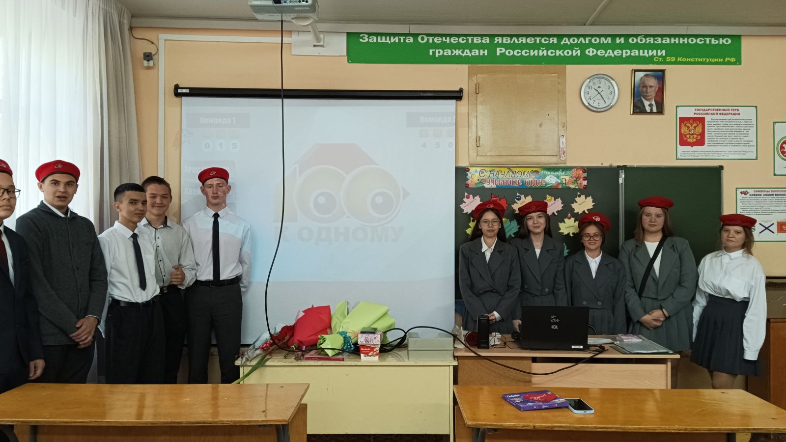 Юнармейский отряд МБОУ СОШ №7 начал новый учебный с «нескучного занятия». С целью сформировать активную позицию юнармейцев в образовательном процессе в предстоящем новом учебном году, ребята участвовали в интерактивной игре 100 к 1 «НЕСКУЧНЫЕ ЗНАНИЯ». Две команды участников по очереди отвечали на вопросы, связанные с днем знаний. Команда мальчиков оказалась чуть-чуть посильнее и победила в финальном этапе.
