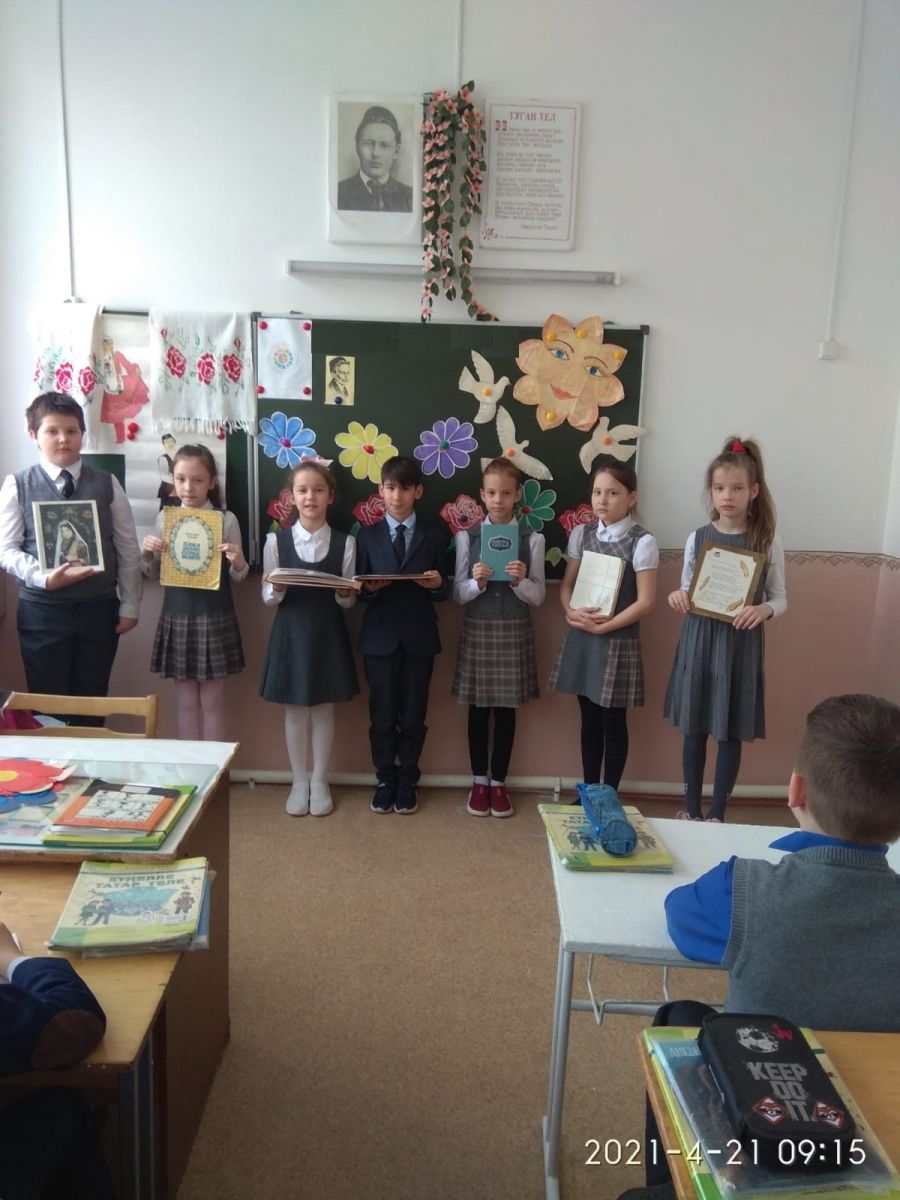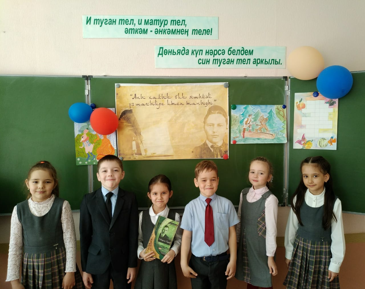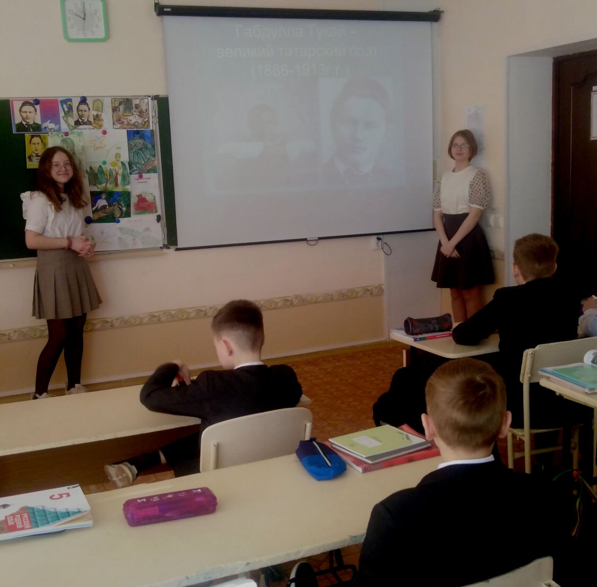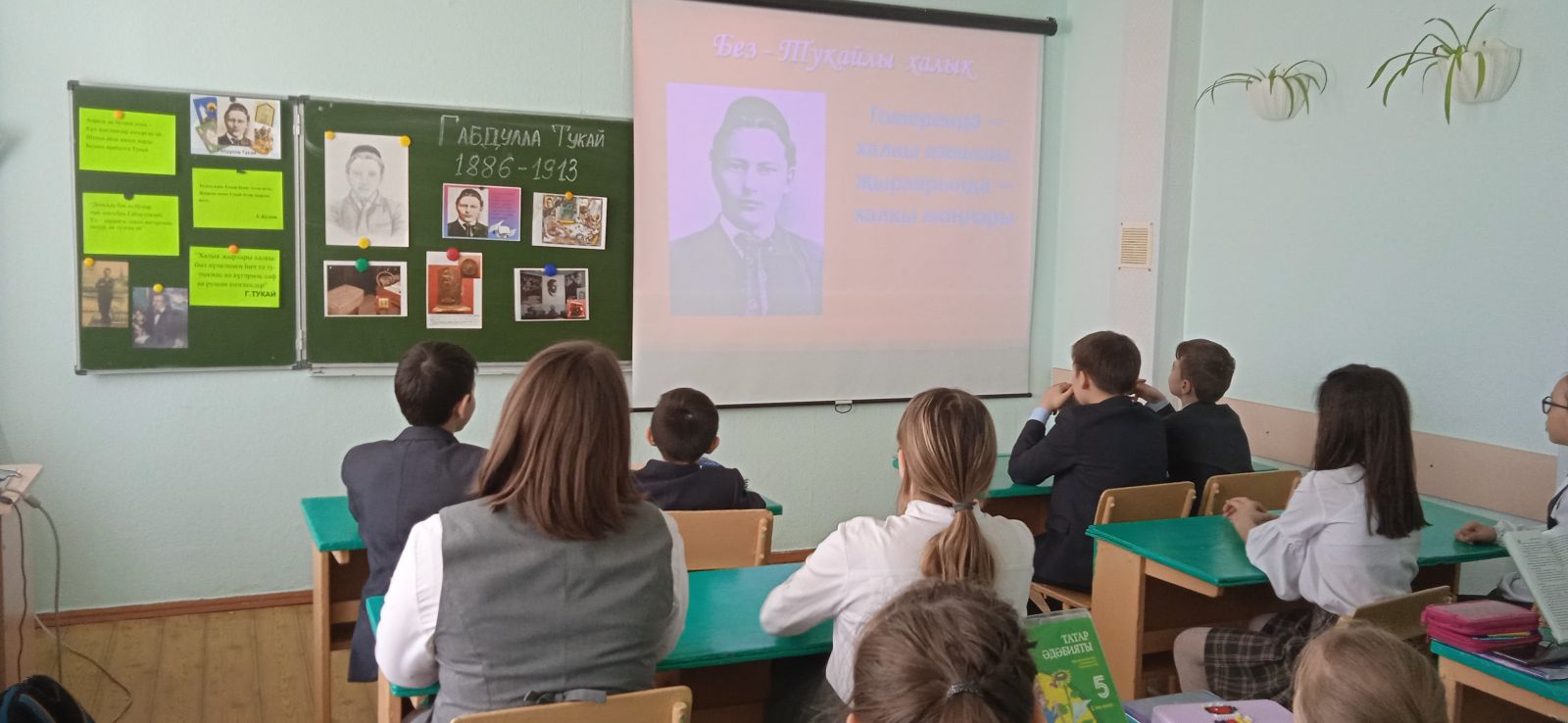 Туган тел һәм әдәбият атналыгы кысаларында, шулай ук күренекле халык шагыйре Г.Тукайның тууына 136 ел тулу уңаеннан, 26 апрель көнне 5В һәм 7А сыйныфларында «Тукайны төрле телләрдә укыйбыз» дип исемләнгән шигырь һәм прозаик әсәрләр дәресе үткәрелде. Балалар бик теләп, Тукай әсәрләре белән таныштырдылар, күпләре үзләренең туган телләрендә шигырьләр укыдылар, ә ахырда Г.Тукайның сүзләренә язылган «Туган тел» җырын башкардылар..jpg)