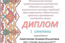 8нче урта мәктәпнең туган тел һәм әдәбияты укытучысы Әхмәтҗанова Э.И. “Татар телен укытуның заманча педагогик практикалары аша милли мәдәниятләрне һәм традицияләрне өйрәнү һәм саклау” дип исемләнгән региональ күләмдәге профессиональ осталык конкурсында катнашып, I урынга лаек булды. Котлыйбыз!