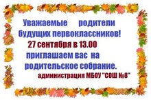 Администрация МБОУ "СОШ №8" приглашает родителей будущих первоклассников 27 сентября к 13.00 на родительское собрание.
