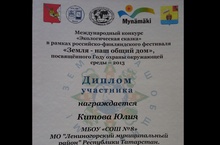 Итоги Международного конкурса "Экологическая сказка" 20.05.2014 Поздравляем ученицу 4 А класса Китову Юлию (кл.руководитель: Арсланова Ф.Ш) с успешным участием в Международном конкурсе "Экологическая сказка" в рамках Российско-Финляндского фестиваля "Земля - наш общий дом".