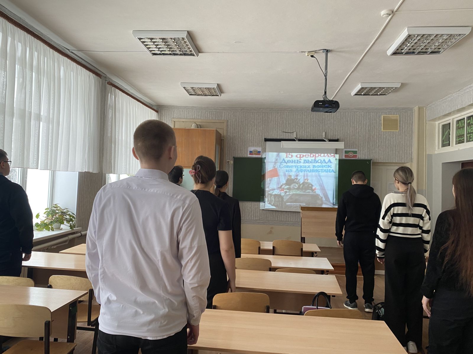 15 февраля 2025 г в 10 А классе прошёл классный час на тему : «К подвигам героев сердцем прикоснись» посвящённый Дню вывода советских войск из Афганистана. Ребята в ходе беседы вспомнили и почтили память героев минутой молчания.