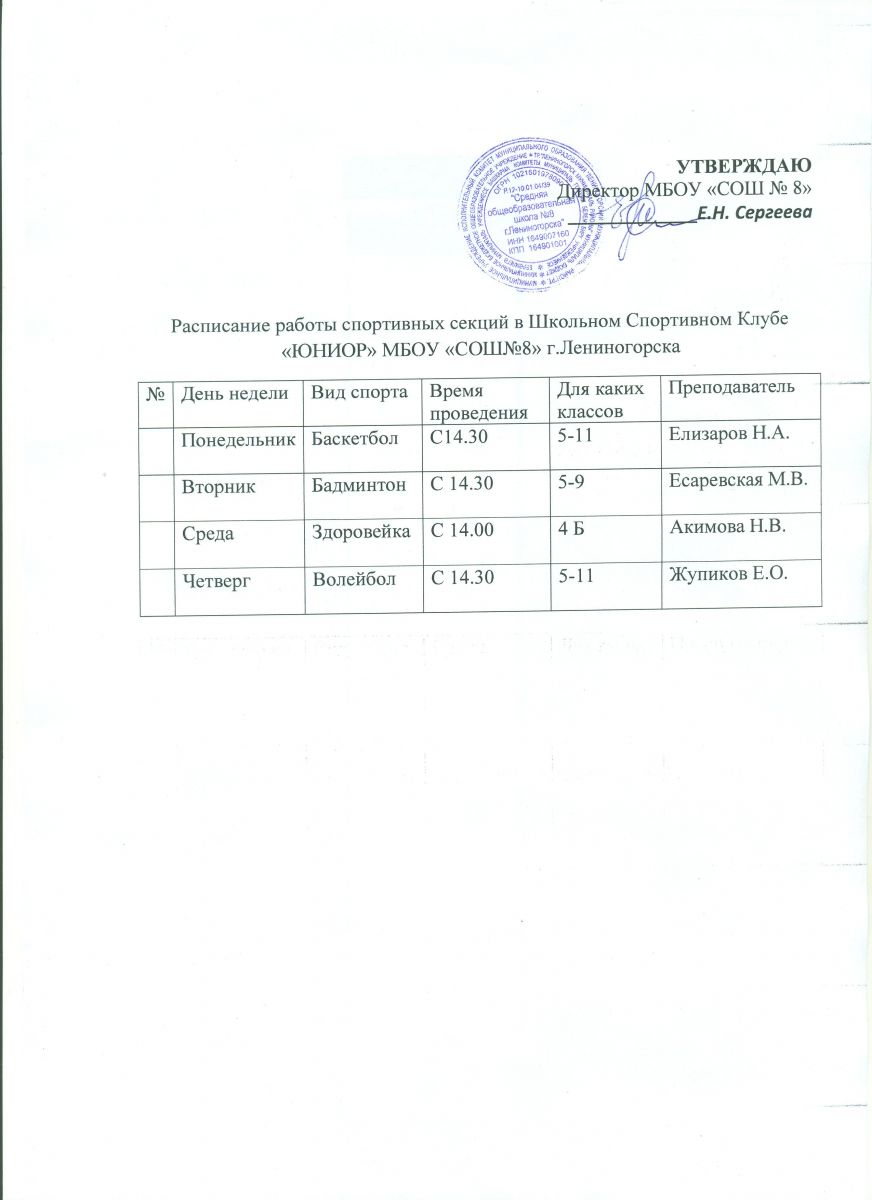Рассписание работы секций в школьном спортивном клубе ЮНИОР