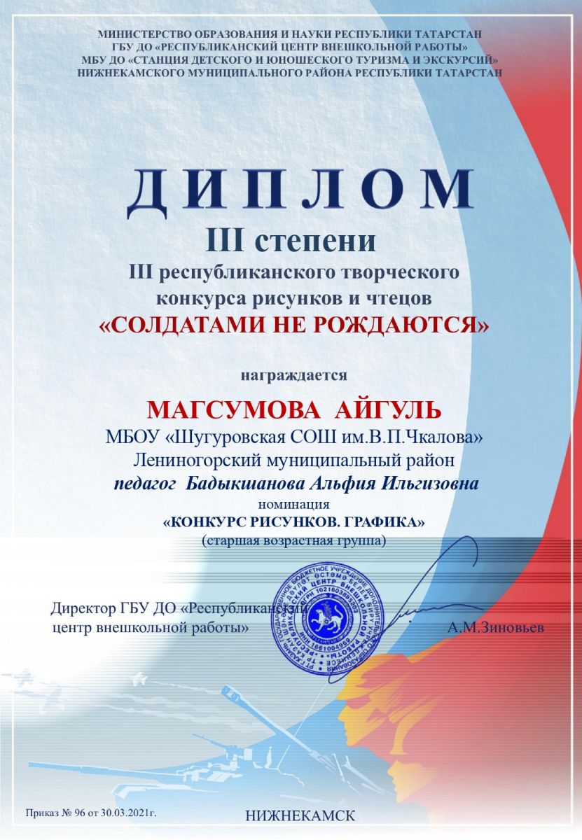 Участники кружка “Проектирование в социальной среде” приняли участие в конкурсе рисунков. По итогам муниципального этапа Республиканского творческого конкурса рисунков и чтецов «Солдатами не рождаются», посвященного 76-летию Победы в Великой Отечественной войне» в номинации рисунок 1 место присудили Магсумовой Айгуль , 3место Закиевой Аэлине. Руководитель - Бадыкшанова Альфия Ильгизовна.