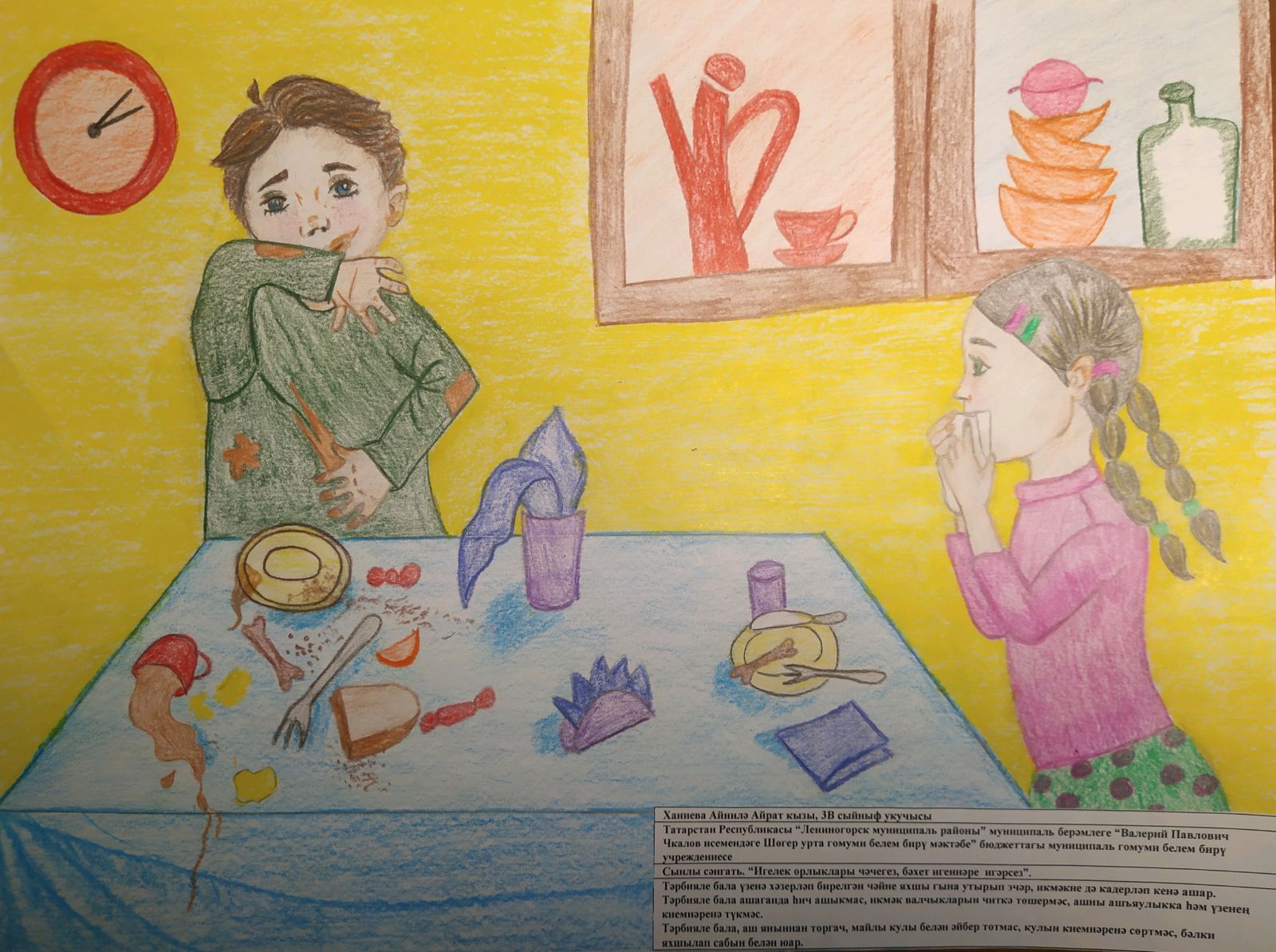 2. “Игелек орлыклары чәчегез, бәхет игеннәре игәрсез”.(”Тәрбияле бала” хезмәте буенча рәсем бәйгесе,1-4 нче сыйныф укучылары өчен). Әлеге юнәлештә 3В сыйныф укучысы Ханиева Айнилә 3 нче дәрәҗә Дипломына лаек булды(җитәкче Сабитова Р.Ш.).