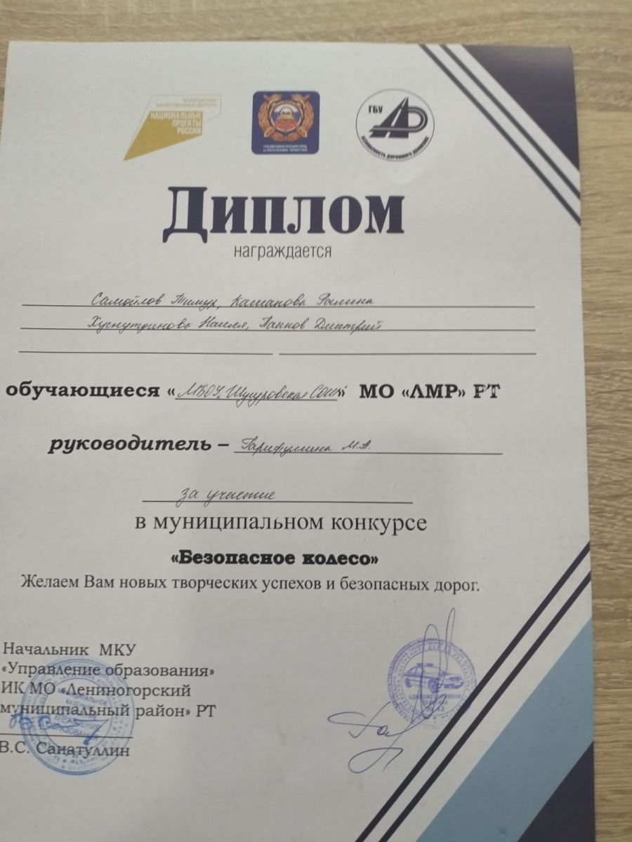 В апреле месяце в г. Лениногорск прошел муниципальный этап республиканского конкурса «Безопасное колесо 2023». Он был организован совместно с ОГИБДД. От нашей школы под руководством Гарифуллиной М.А. были направлены участники отряда ЮИД: Панков Д., Самойлов Т., Кашапова Р., Хуснутдинова Н., учащиеся 5-х классов. Они с честью выступили в 1 туре, сдав зачеты по знанию ПДД, основ первой доврачебной медицинской помощи и агитационно-пропагандистское выступление детей. Из 20 команд наша команда «Светофорики» вошла в 5-ку финалистов. Во 2 туре участники соревновались в индивидуальном вождении велосипедов. Ребята не подвели свою школу и стали призерами.